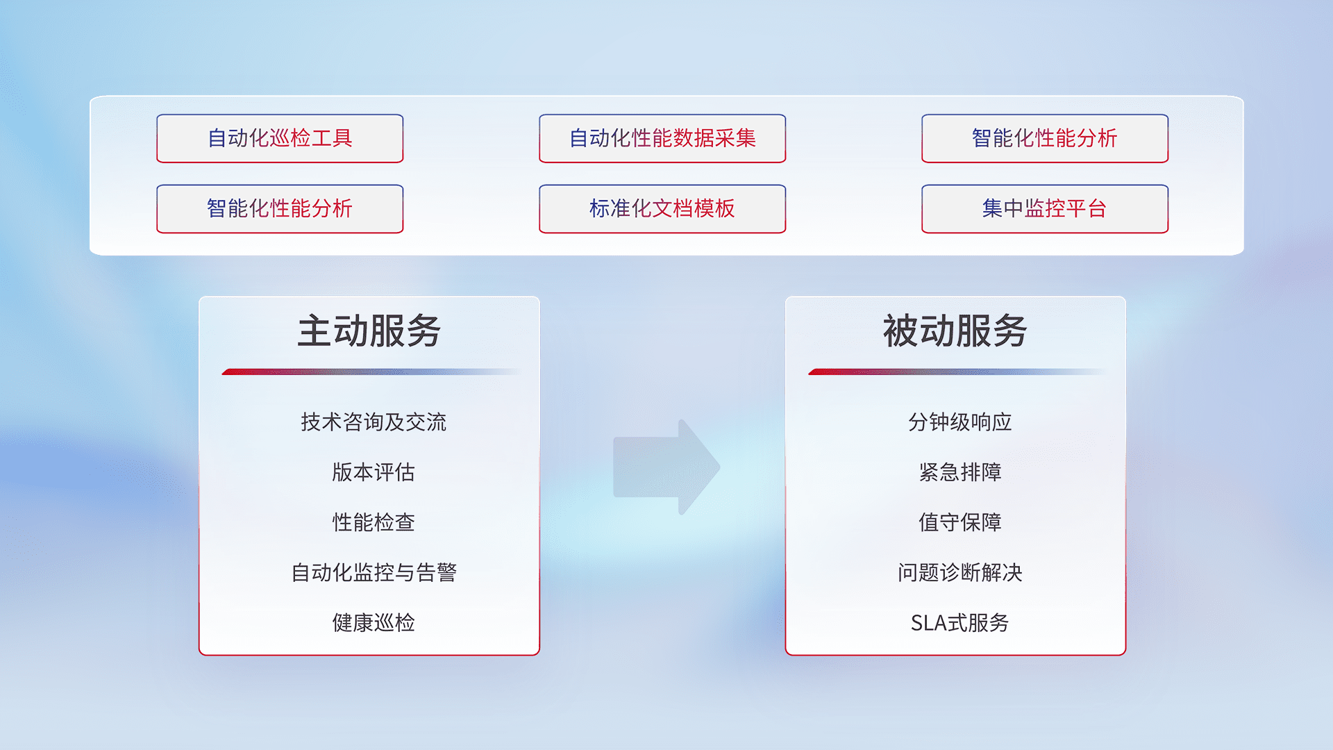 智能化工具和标准化文档,,,保障服务质量,,,,提供主动服务(包含技术咨询、、、、版本评估、、性能检查、、、、自动化监控与告警、、、、健康巡检)和被动服务包含(分钟级响应、、紧急排障、、、值守保障、、、、问题诊断解决、、、、SLA服务)。。。