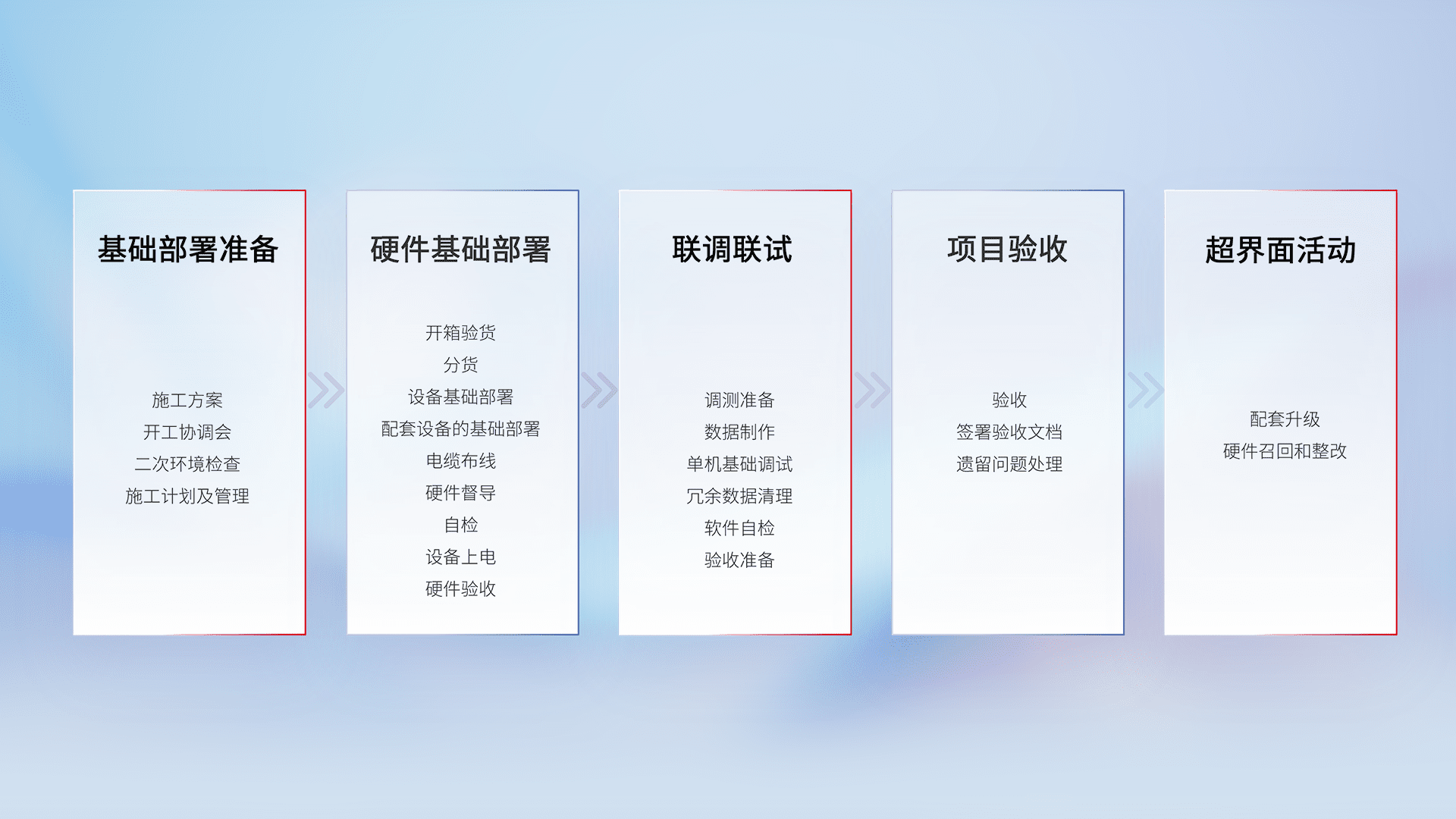 从基础部署准备、、硬件基础部署、、联调联试、、、项目验收、、、、越界面活动的全过程可追溯,,,保证施工质量和进度。。。。